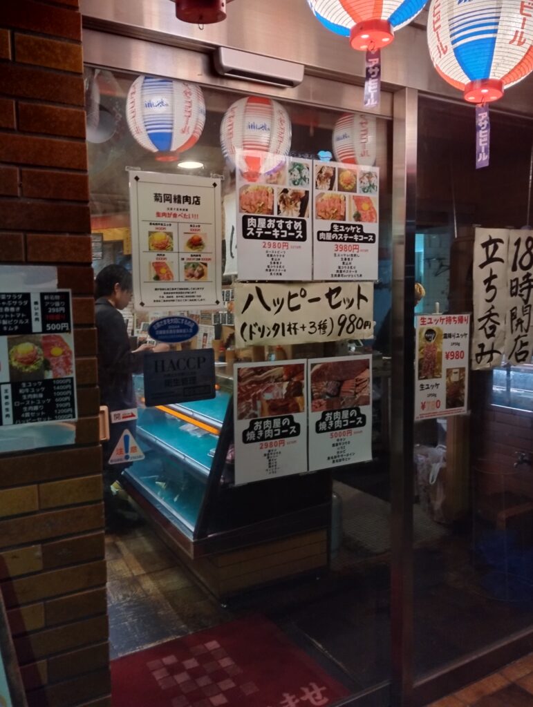 情報筋によると、菊岡精肉店というお肉屋さんが営む立ち飲み屋らしい。昼帯は普通の街のお肉屋さん、そして夜の顔は立ち呑み営業をしているらしい。