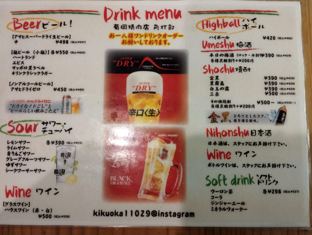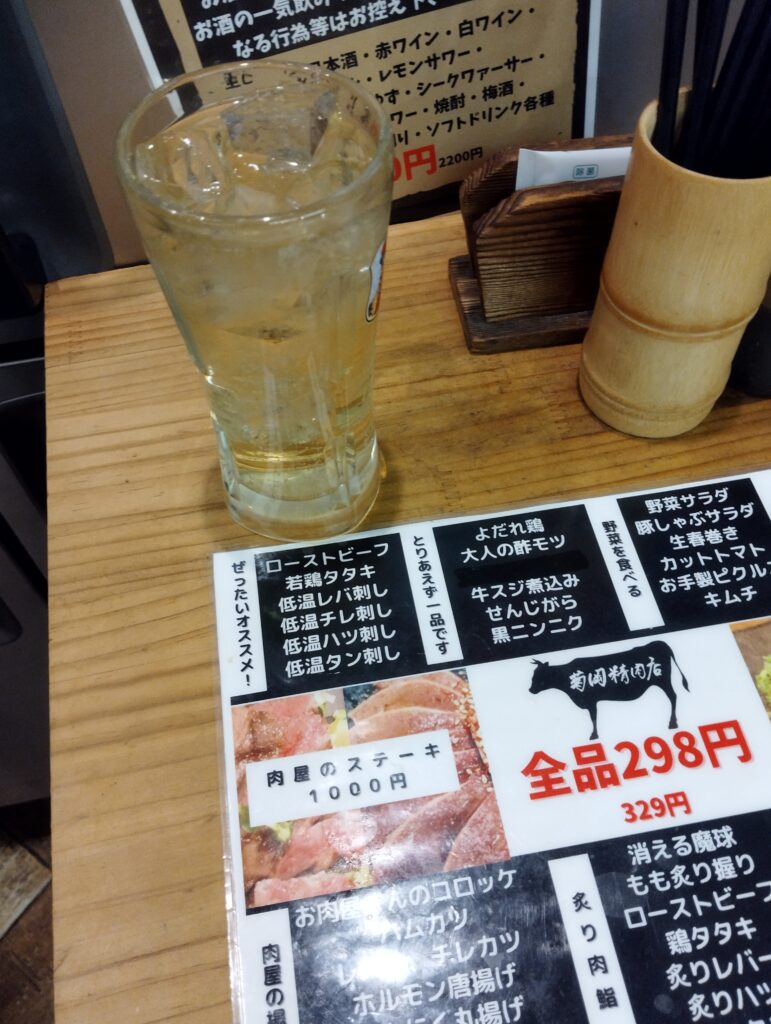ハイボールが届く。まあ普通にうまい、ホッピーの方が好きだが、なければハイボール一択、確実に酔える。他の店では店員氏が「何ハイボールにしますか?」なんて聞いてくるが、貧乏舌のよいどれおじさんに繊細な味の違いがわかると思うか?聞くだけ野暮ってもんよ…。「菊岡精肉店」はその点潔い、角ハイボールでもジンジャーハイボールでもなく、シンプルな「ハイボール」しかない。