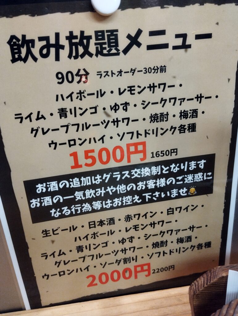 店内チェック。いい感じのフォントの看板。飲み放題メニューもある。明日も仕事なので、さすがに今日はそこまでは飲めないよぉ。日和ったおじさんは、今日はおとなしくハウスだな…。