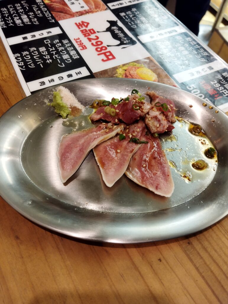 そして、お待ちかね、生肉を探す。メニュー左上「ぜったいオススメ!」しか目に入らない。世の中に「ぜったい」なんてないんだぜ…。低温レバ刺しと低温タン刺しをオーダー。全品298円・ニクヤとかけた粋な価格。
