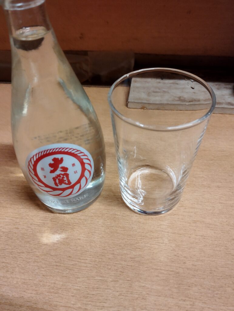 飲料が届く。よしよし「大関」、いつもワンカップでお会いしてますが、本日は瓶詰されているな。