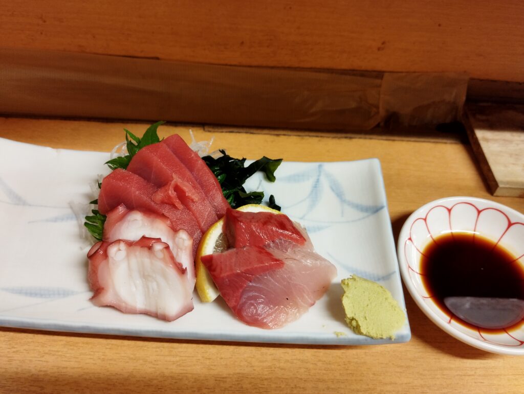 はい次、「おまかせ造り三種盛合」が来たゾ。マグロ、タコ、ブリ、最強の組み合わせ。