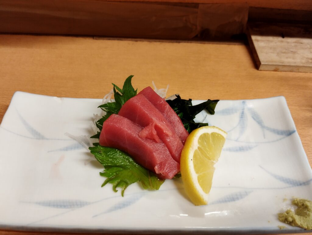 先ほど大将が「刺盛あがりぃ~」って発声した直後、「マグロおしまぃ~」っておっしゃってませんでしたか?つまり本来的には2切れ3種のところ、ワタクシにサービスで端数で残ったマグロ1切れ追加してませんか…?(勘違いだったらごめんなさい)。ありがてぇ…と思うことにした。