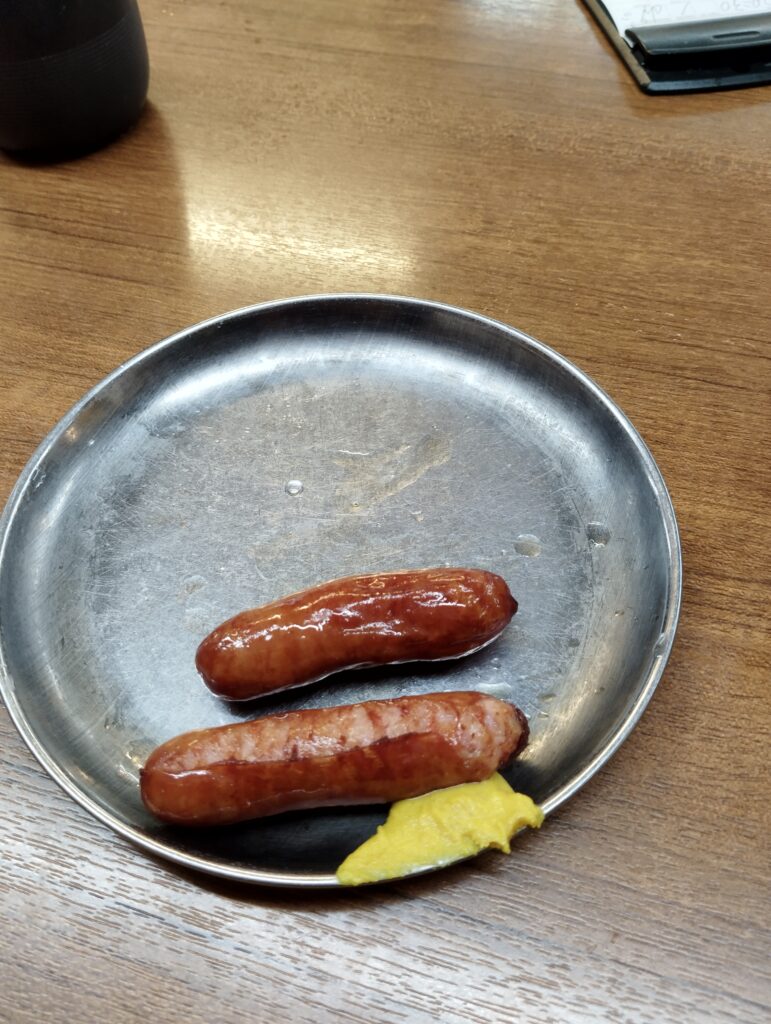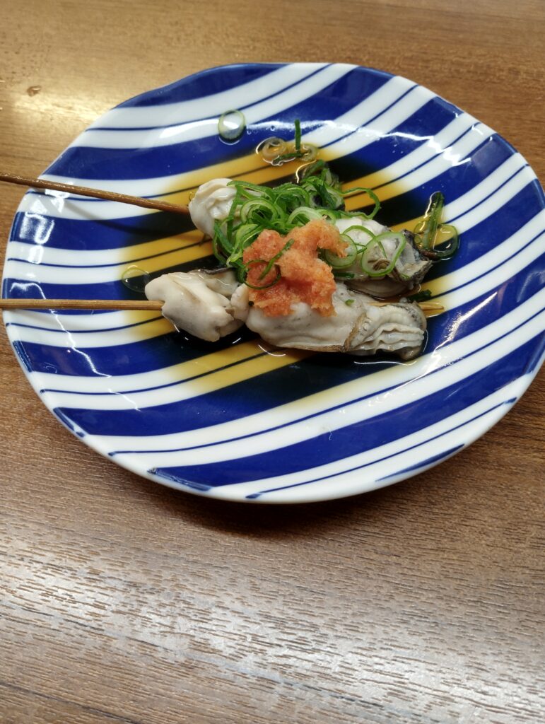 表面張力つるつるいっぱい、これはありがてぇ…。コップを口が迎えに行く。グビっ!いつもの味、変わらない味、こいつは間違いないな。「大関」が呼び水になり、うっかり追加でウィンナー(揚げ)とカキ湯引きをオーダー。
