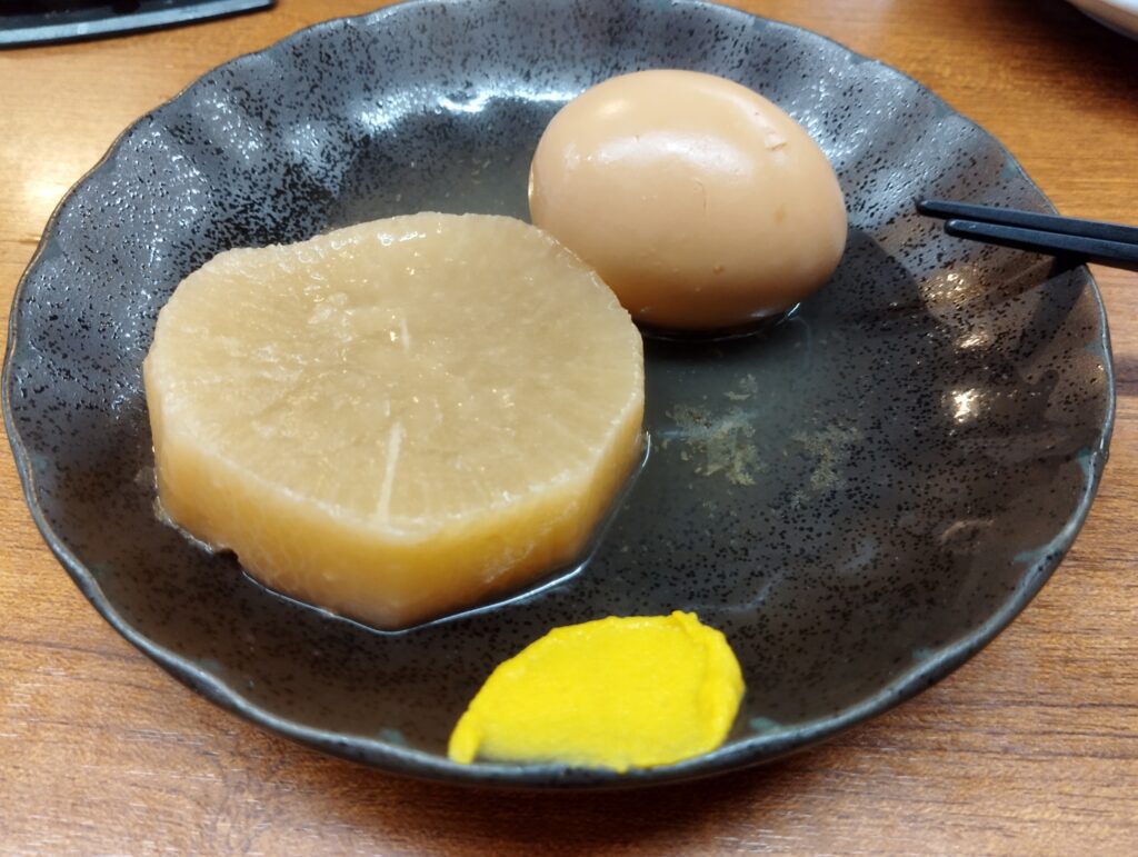 ベテランの店員氏から、他追加ないかい?とのお誘いが…。大関が少し残っている、最後にこいつとマリアージュさせるとすれば、それはもちろんアレだよな…。おでん、それも大根と玉子、そいつをオーダーしたその時、ベテランの店員氏が「わかってるねぇ…」とニヤっとしたような気がしたのは、きっと気のせいだろう。