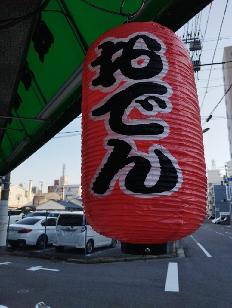 暖簾は新しめ、ターコイズブルーっていうのかい?イカシた色だな…。円形の看板もよろしい。ほんなら、一呼吸おいてから、入店するゼ…?