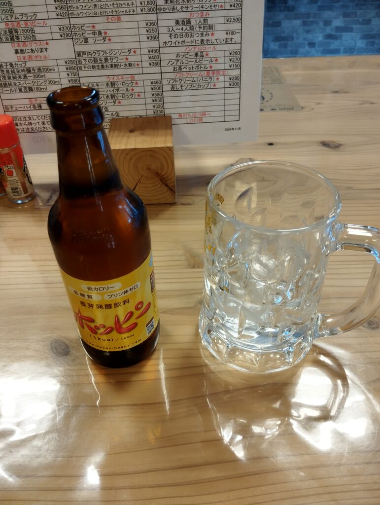 大人飲料が届く。ホッピーは、リターナブルの業務用ホッピーではない、家庭向けの「ホッピー330」。近所のスーパーなどでも見かけるよな?業務用のそれと比べると30mlほど少ないが、中身は同じ。業務用ホッピーの方は基本的には関東・東日本で流通のため、ここ広島では必然「ホッピー330」になる。