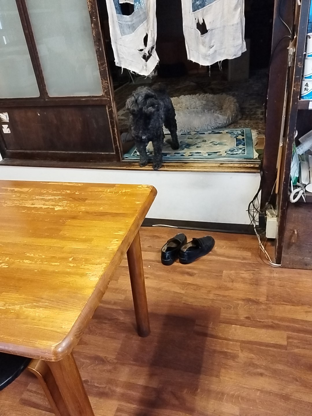 動物と飲食店は本来的には水と油、生理的に無理な人は多い。しかしこのワンコ、分相応という言葉を知ってか知らでか、そこらへんわきまえているようで、奥の居住スペースからこちら側には踏み出してこないようだ…。最初は新人のワタクシに吠え散らかしていたが、動物好きのオーラが伝わったのか、その後は吠えなくなったので、バ〇犬ではない、否、利口な犬なんだろう。