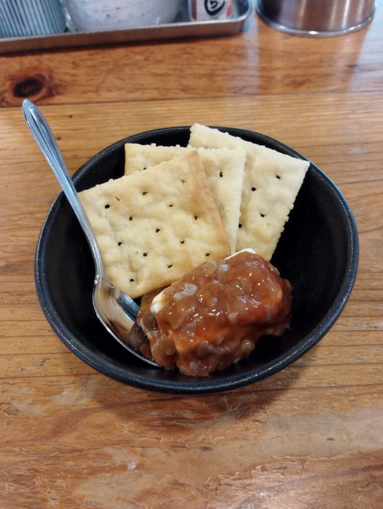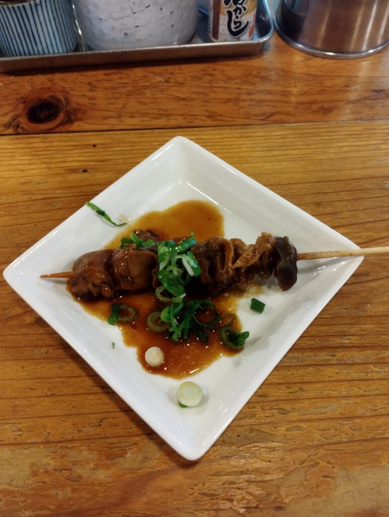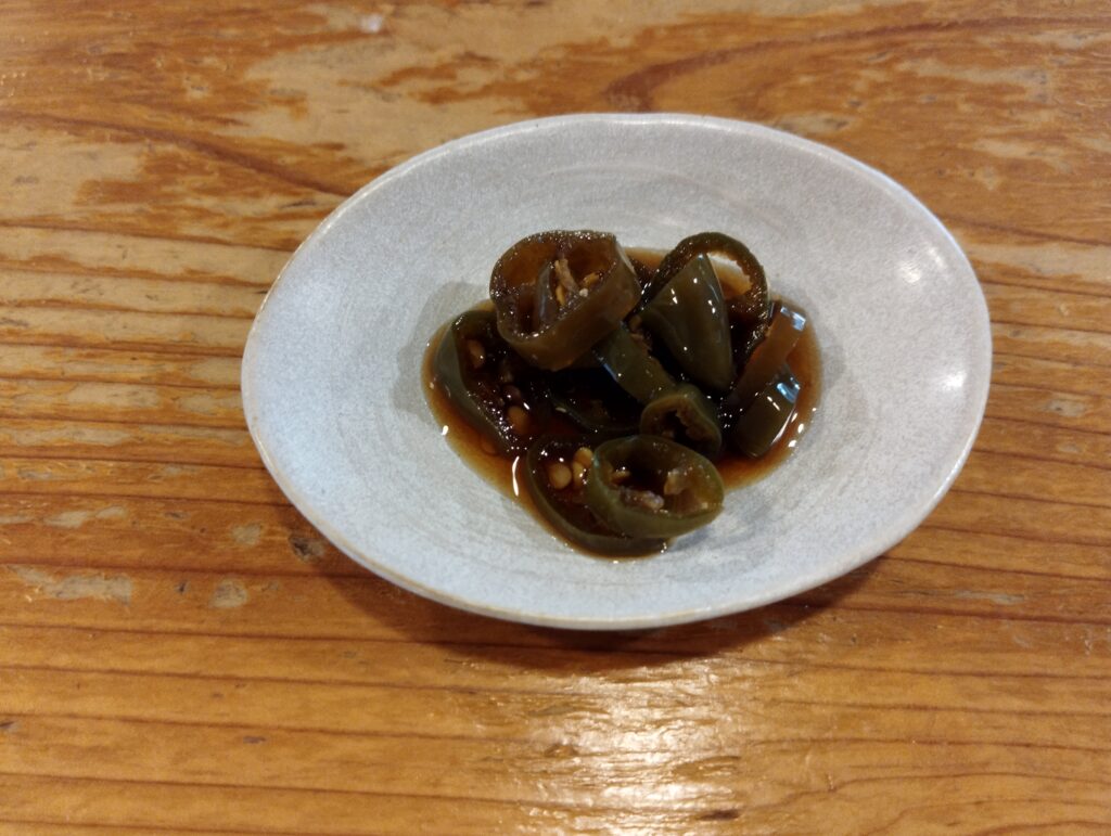 喉を潤したので、次はマミツーだな…。どて焼き、酒盗ONクリームチーズ、唐辛子漬け?をオーダー。