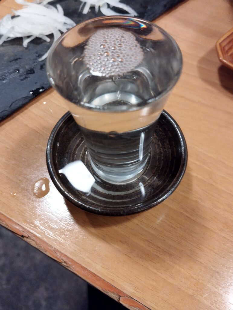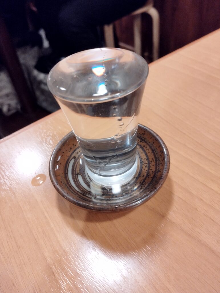 グラスを半分くらいまで飲み干し、下の皿の日本酒をグラスに注ぐ。おかわりのようでうれしい。