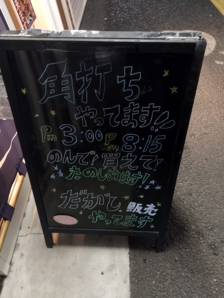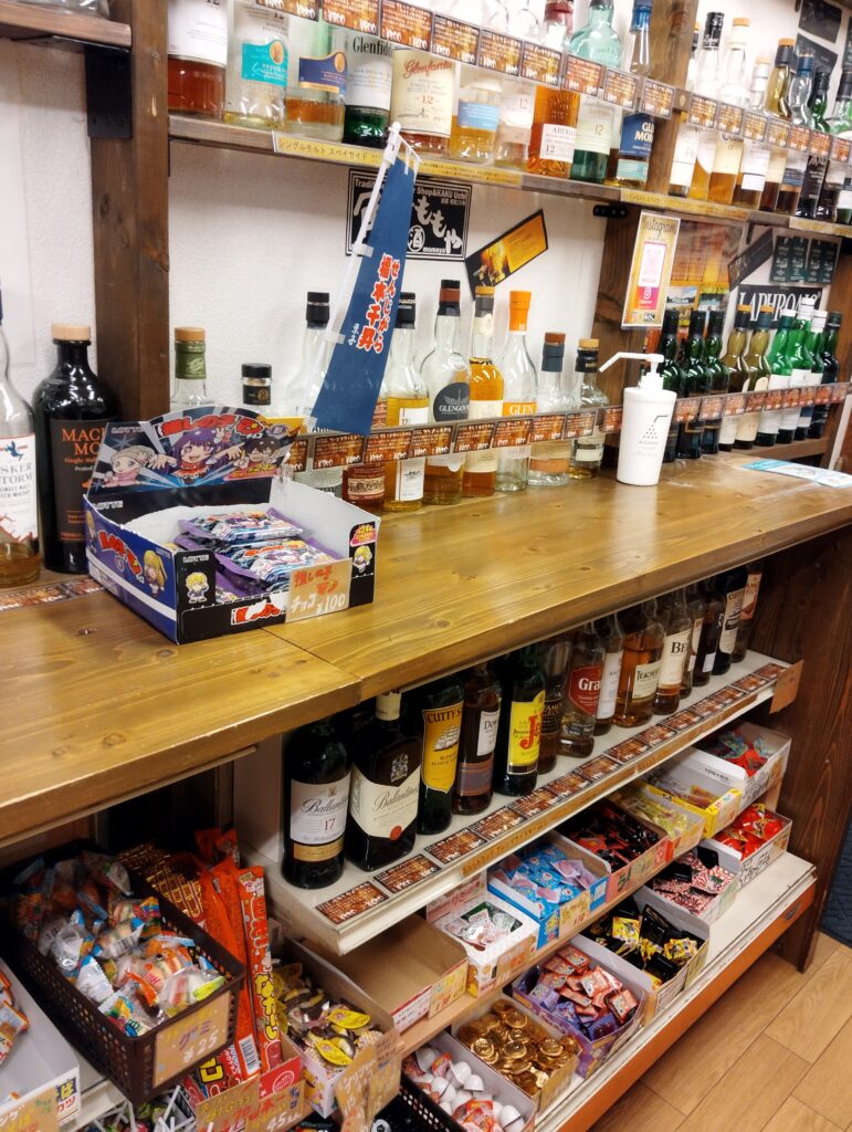 昭和29年創業の酒屋が営む角打ち、取り扱うお酒はウィスキーが豊富なものの、日本酒もあり各種一品料理もありの、さらには駄菓子でも呑めるという、天国のような場所である。童心に帰って、昇天しよか…?入店。