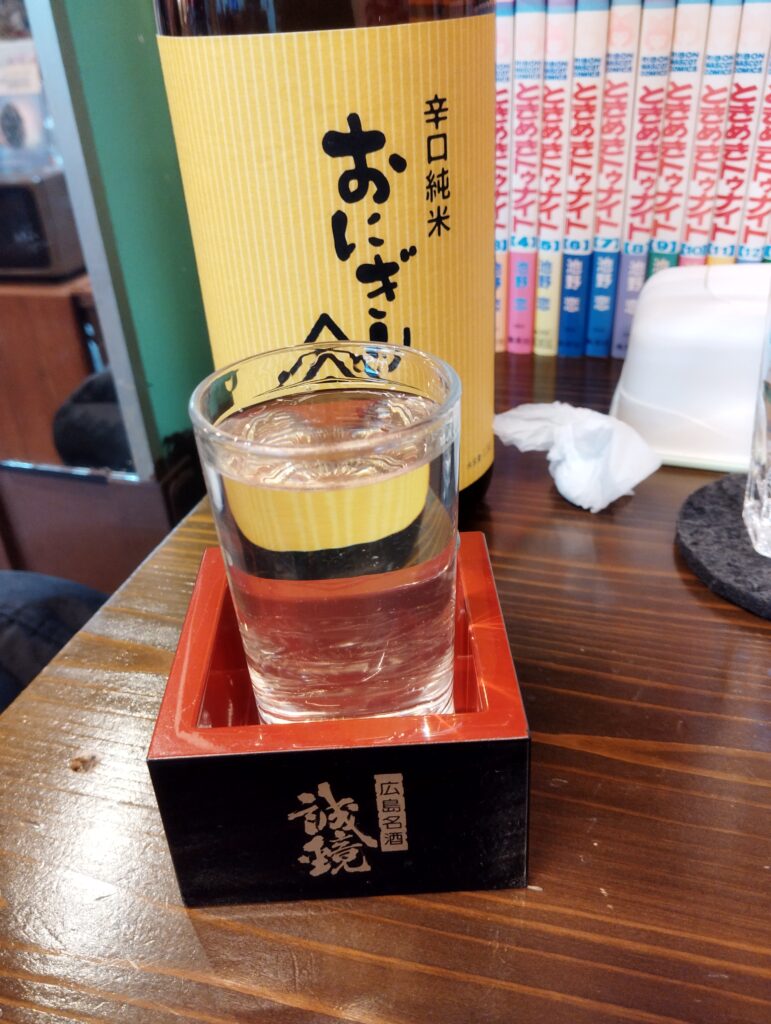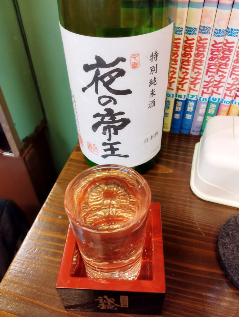次に頼んだのはこちらも広島の日本酒「夜の帝王」。背景の少女漫画「ときめきトゥナイト」とまさかの「夜」かぶりをしてしまう…。グビっ!「夜の帝王」も水のように飲む。貧乏舌のよいどれおじさんでも、「うまい」か「まずい」かの区別くらいはつく。これは「うまい」のほう。