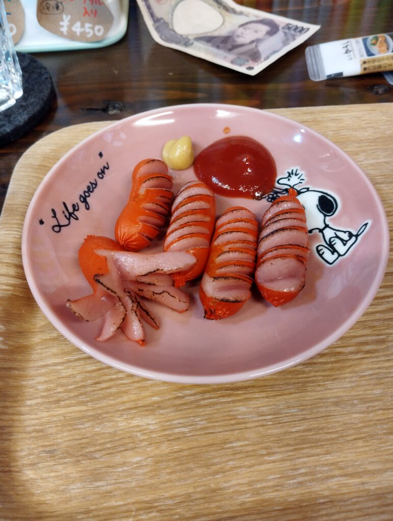 メニューを見る。まずは大人飲料…。ダメ元で聞いたがホッピーはないとのこと、残念。広島の日本酒「おにぎり」を頼む。つまみはと…、ウィンナーとおでんをオーダー。残念ながら好物のポテサラは完売とのこと。